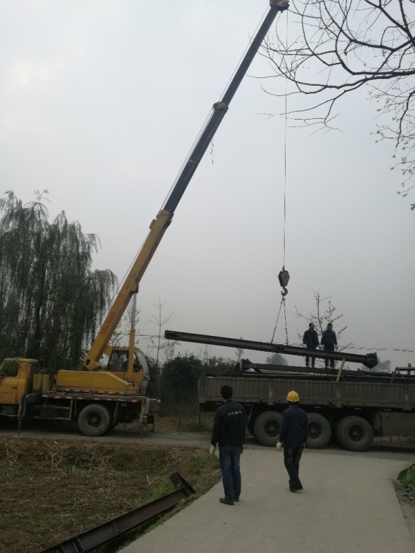 鋼構(gòu)件由平板車運輸進場,吊車進行起吊卸車